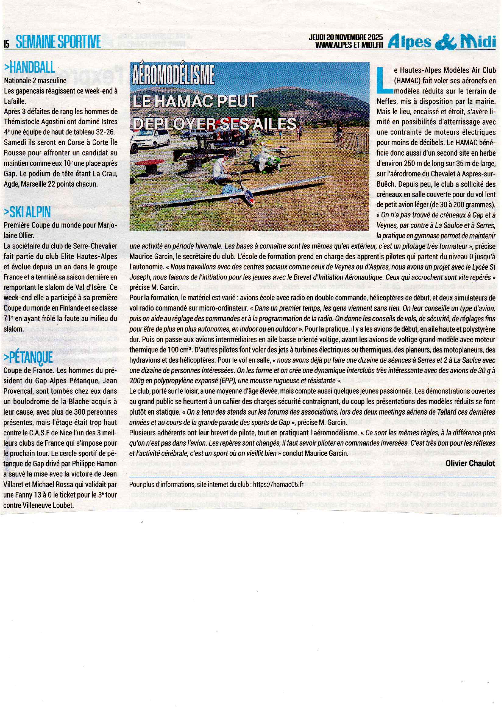 Depuis ses terrains de Neffes et Aspres‑sur‑Buëch jusqu’aux séances en gymnase de La Saulce et Serres, le Hautes‑Alpes Modèles Air Club (HAMAC) offre aux passionnés jeunes et moins jeunes un espace complet de pratique de l’aéromodélisme : formation, vol extérieur, vol intérieur et simulation.