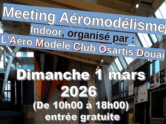 L'Aéro Modèle Club Osartis Douai organise un Spectacle Aérien d'Aéromodélisme indoor dimanche 1er mars 2026 à la salle des sports COROT à Douai.