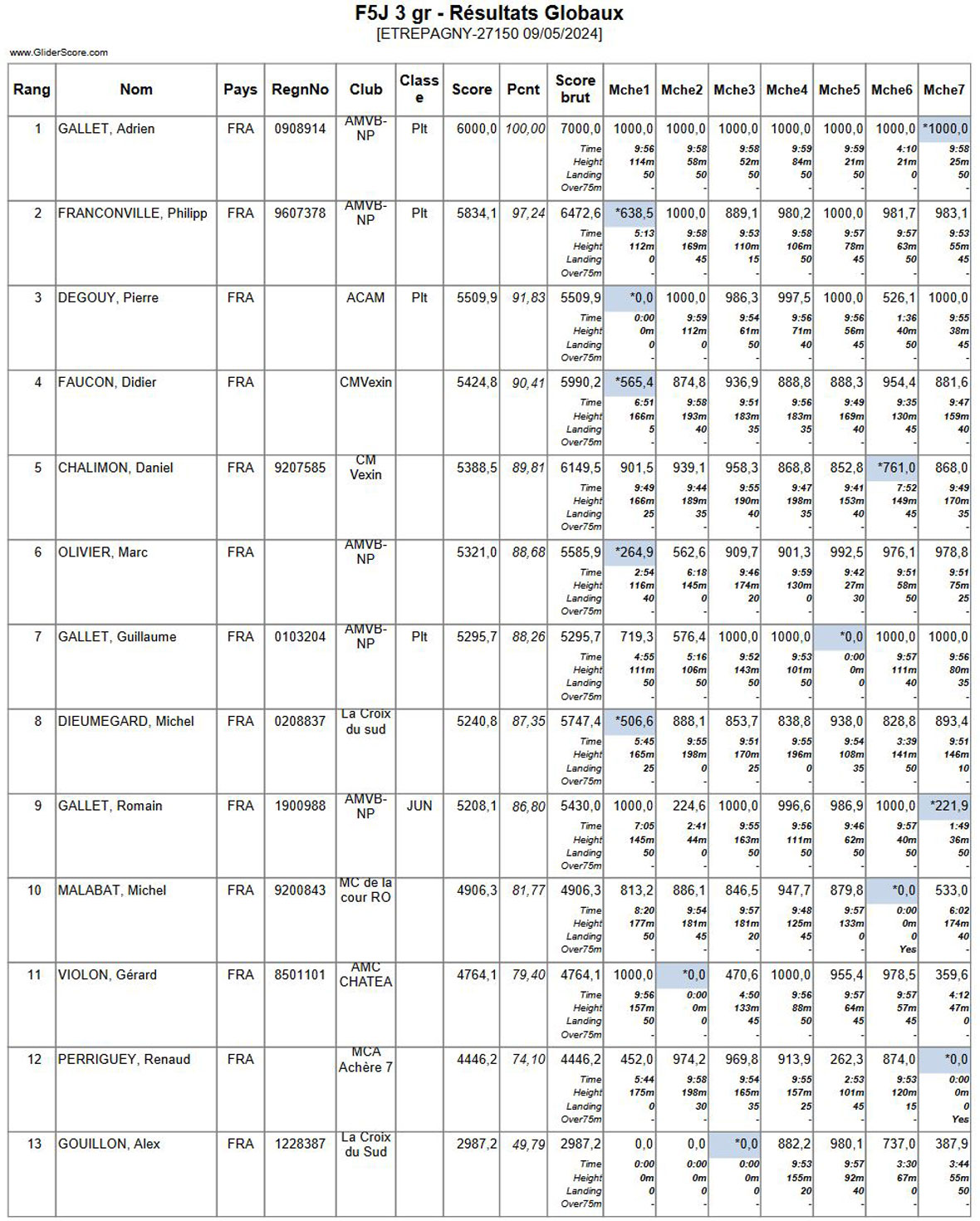 Le concours F5J se déroule en petit nombre en ce jour à Etrépagny certes, mais le niveau est élevé pour les treize concurrents qui s'étaient donné rendez-vous en ce jeudi 9 mai, l'équipe de France F5J presque au complet et deux champions du monde...