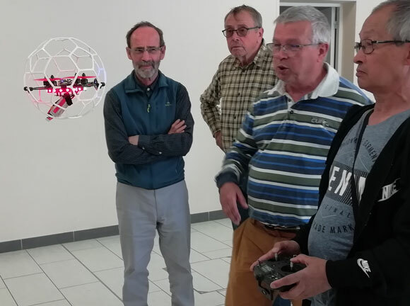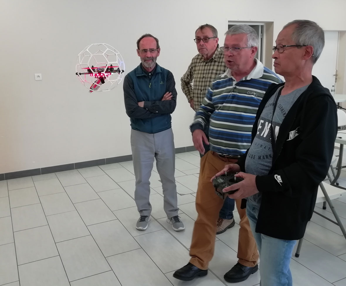 Plusieurs modèles ont ainsi pu faire leurs premiers vols au fond de la salle de réunion. Les pilotes habitués aux drones multirotor nous ont montrés que les machines volaient parfaitement. Certains pilotes d’avions, même en mode 1 ont pu décoller et après une prise en main parfois rebondissante… ont pu manœuvrer dans un espace assez réduit !