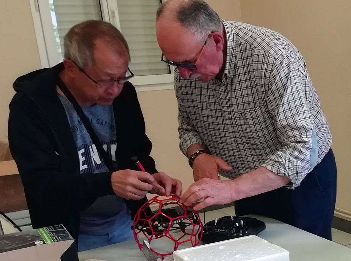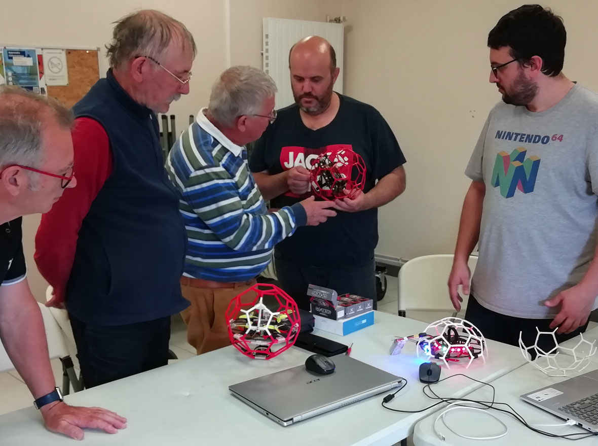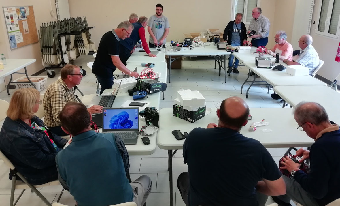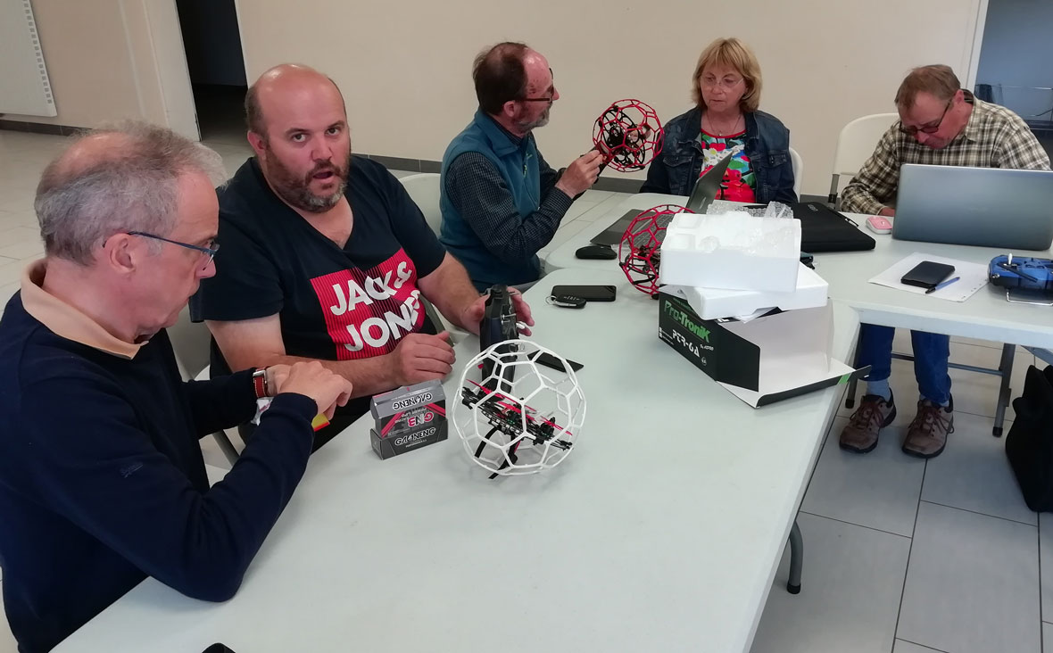 7 kits de drone soccer étaient à monter, en provenance de https://helicoracing.com/, dont 4 du CDAM, plus 2 ou 3 modèles persos. Après le déballage et la découverte du matériel, passage au « bindage » avec des radios Protronik ayant la faculté de passer rapidement d’un mode à l’autre, pour que la découverte du pilotage soit à la portée du plus grand nombre. Tristan nous a ensuite entrainé dans le labyrinthe de « Betaflight » pour procéder au réglage des nombreux paramètres de vol de nos nouvelles machines.