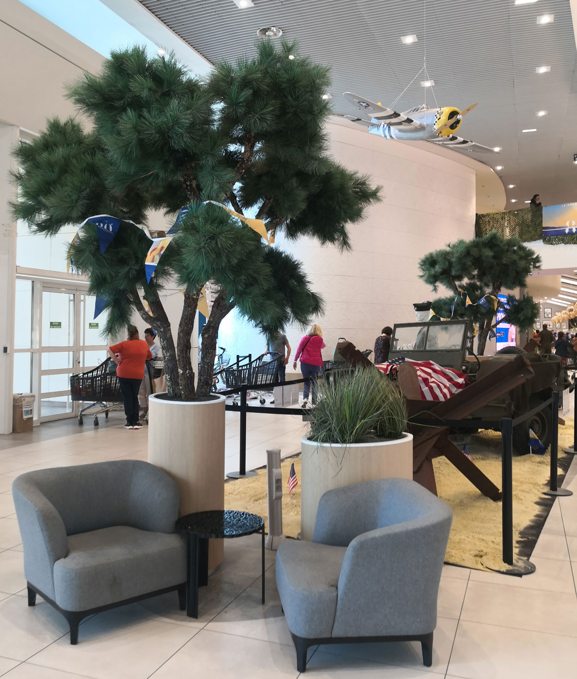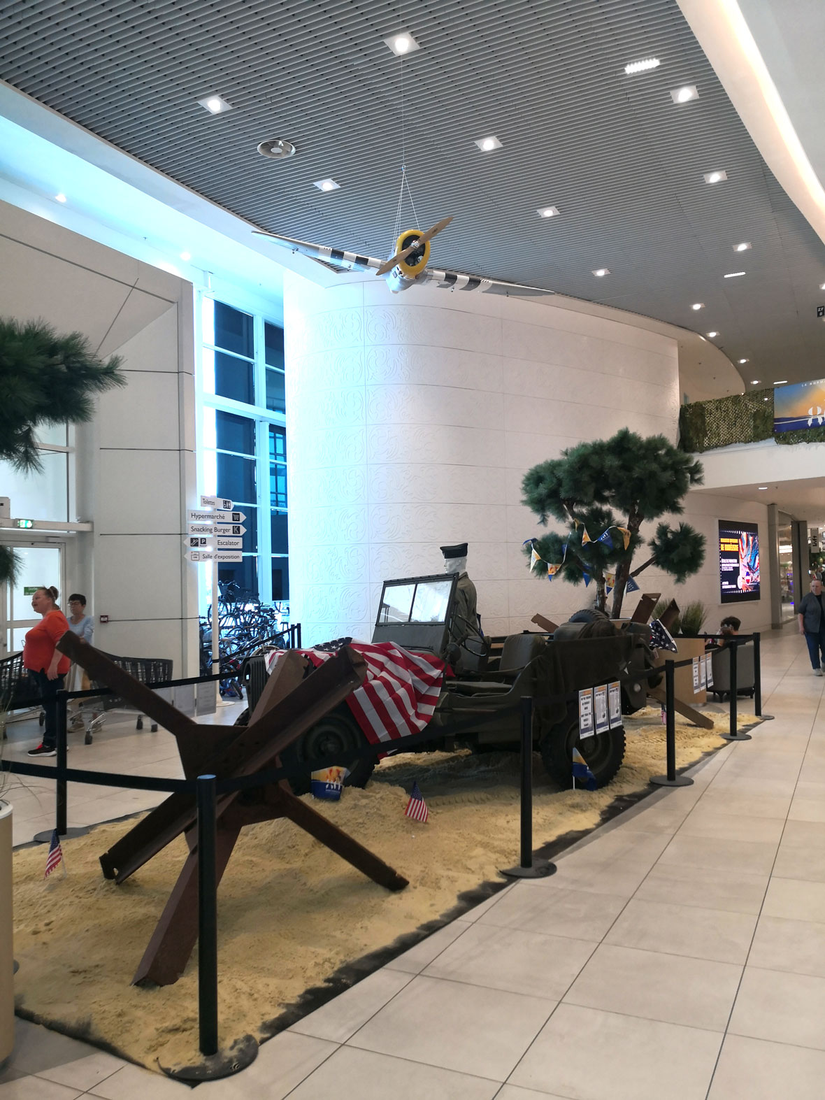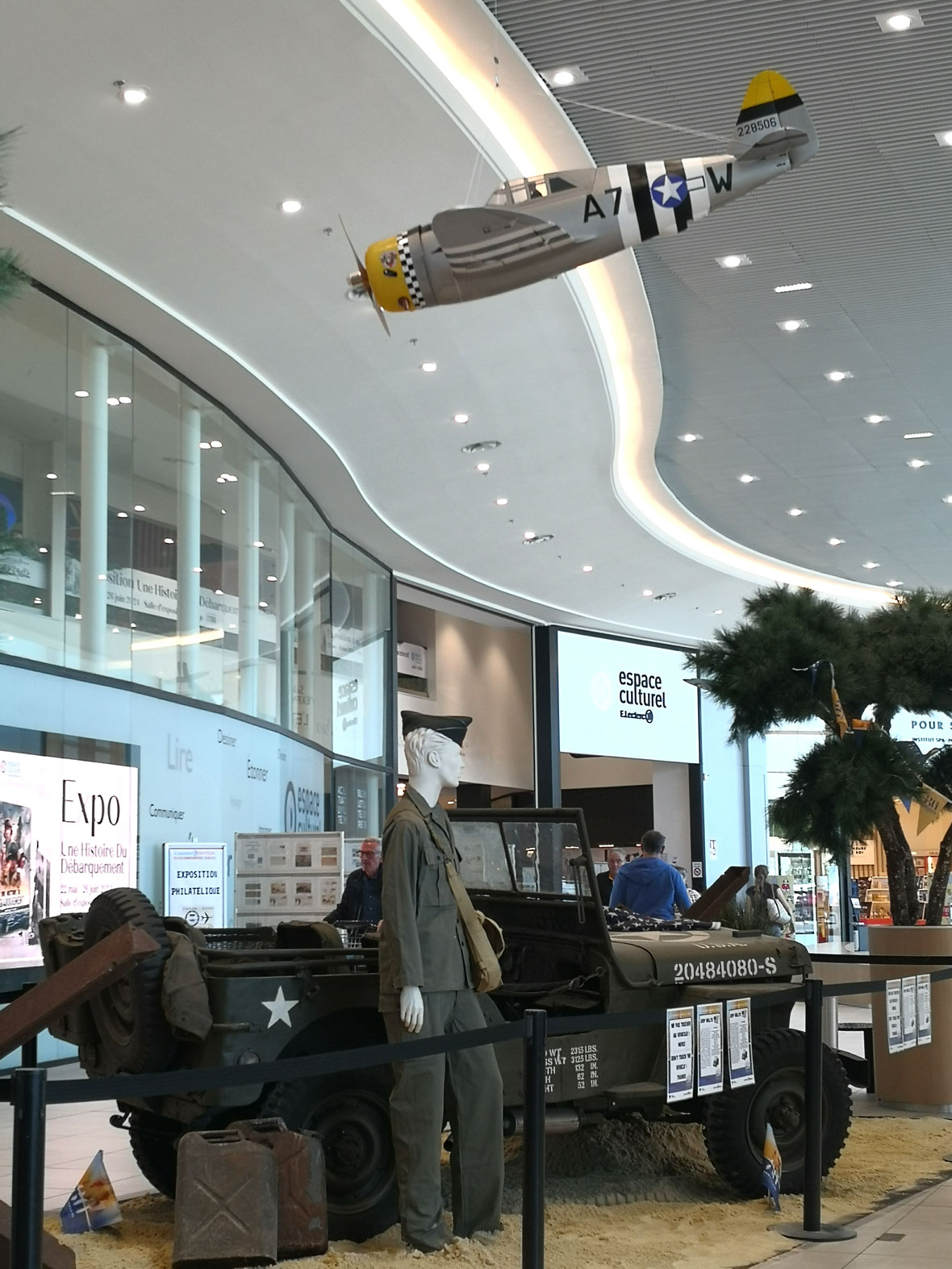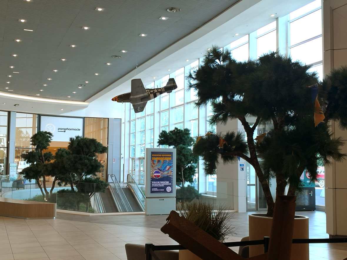 Ainsi, les L-4, P-47, P-51, Spitfire, Typhoon et Waco exposés surplombent la galerie marchande depuis le 21 mai et seront sous les feux de la rampe pendant attireront plus d’un mois.