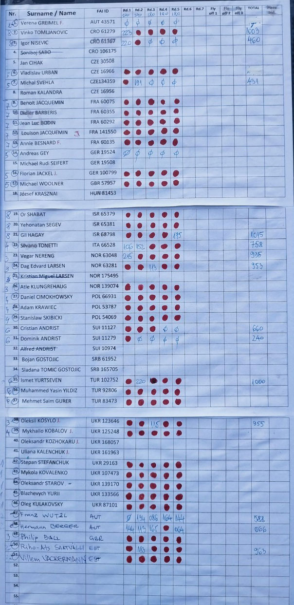 Pour les F1B, toute l'équipe et le chef d'équipe ont concouru dans le même round d'une heure. C'était intense, mais cela a constitué un bon entraînement pour les championnats d'Europe. Tous ont réussi à faire le plein et se sont retrouvés au fly-off de 8 minutes. Louison, Didier et moi avons atteint les 8 minutes, Jean Luc a fait un peu plus de 4 minutes à cause d'une minuterie trop courte, et Annie n'a pas eu le temps de lancer, ayant seulement 7 minutes pour remonter et partir.