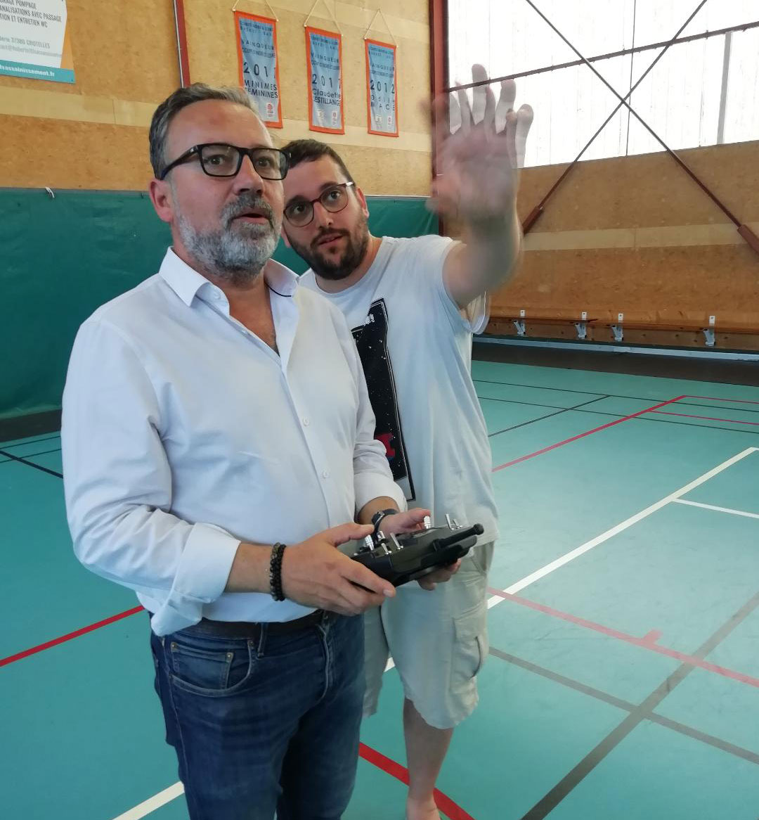 Double commande manuelle ... Pas simple ! Initiation au pilotage de drone soccer avec M. Lebreton, Vice-président du Conseil départemental d'Indre et Loire, chargé des sports