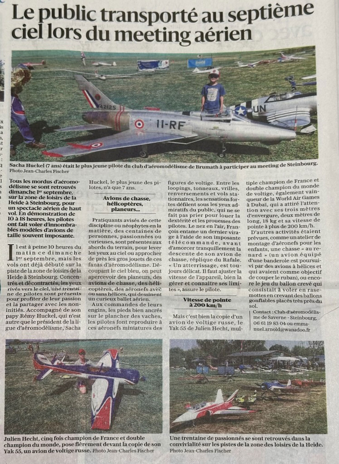 Tous les mordus d’aéromodélisme se sont retrouvés dimanche 1er septembre sur la zone de loisirs de la Heide à Steinbourg pour un spectacle aérien de haut vol. En démonstration de 10 à 18 heures, les pilotes ont fait voler d’innombrables modèles d’avions de taille souvent imposante.