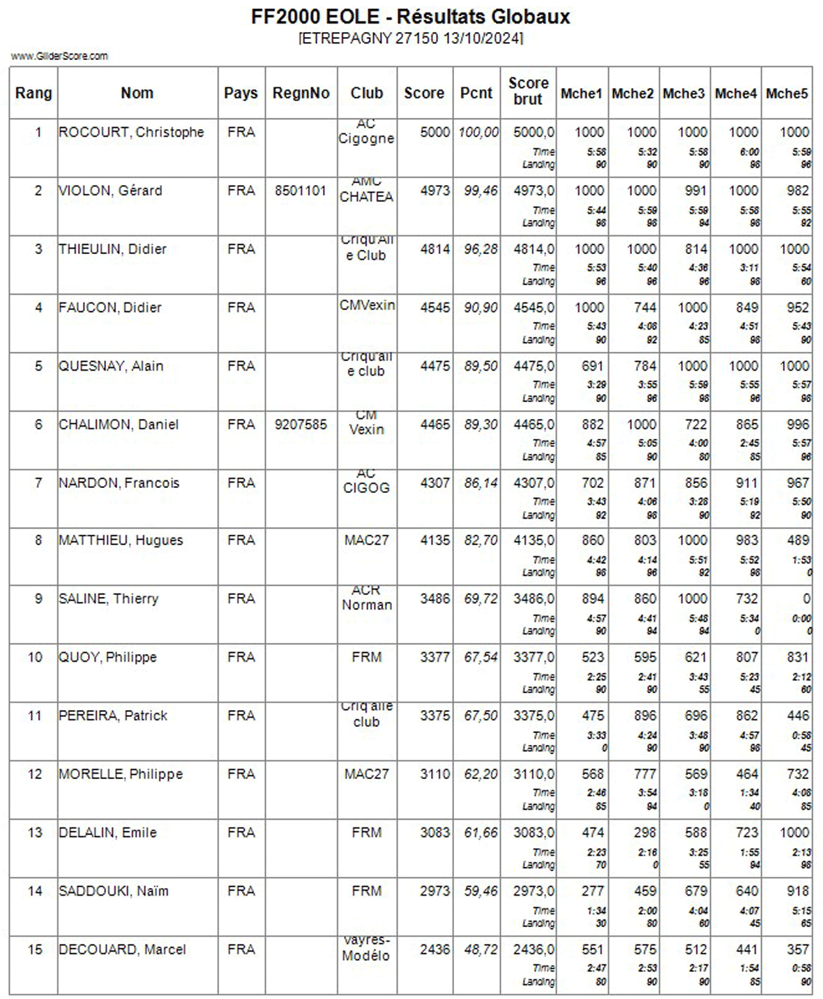 Petite innovation cette année, les juniors volant sur des planeurs F3L (2m formule RES), une ligne spécifique avait été ajouté aux 4 autres assurant des séries mixtes à 4 pilotes.