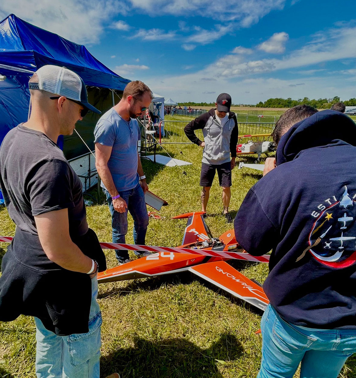 Après les vols, les avions ont été déplacés en zone publique pour permettre au public de les observer de plus près. Les conditions météo ont obligé les bénévoles à faire preuve d’ingéniosité : barrières sans bannières pour éviter les prises au vent, avions posés au sol et sous surveillance constante. En fin de journée, les rafales devenant trop fortes, les modèles ont été mis à l’abri et la tente de la Fédération démontée.