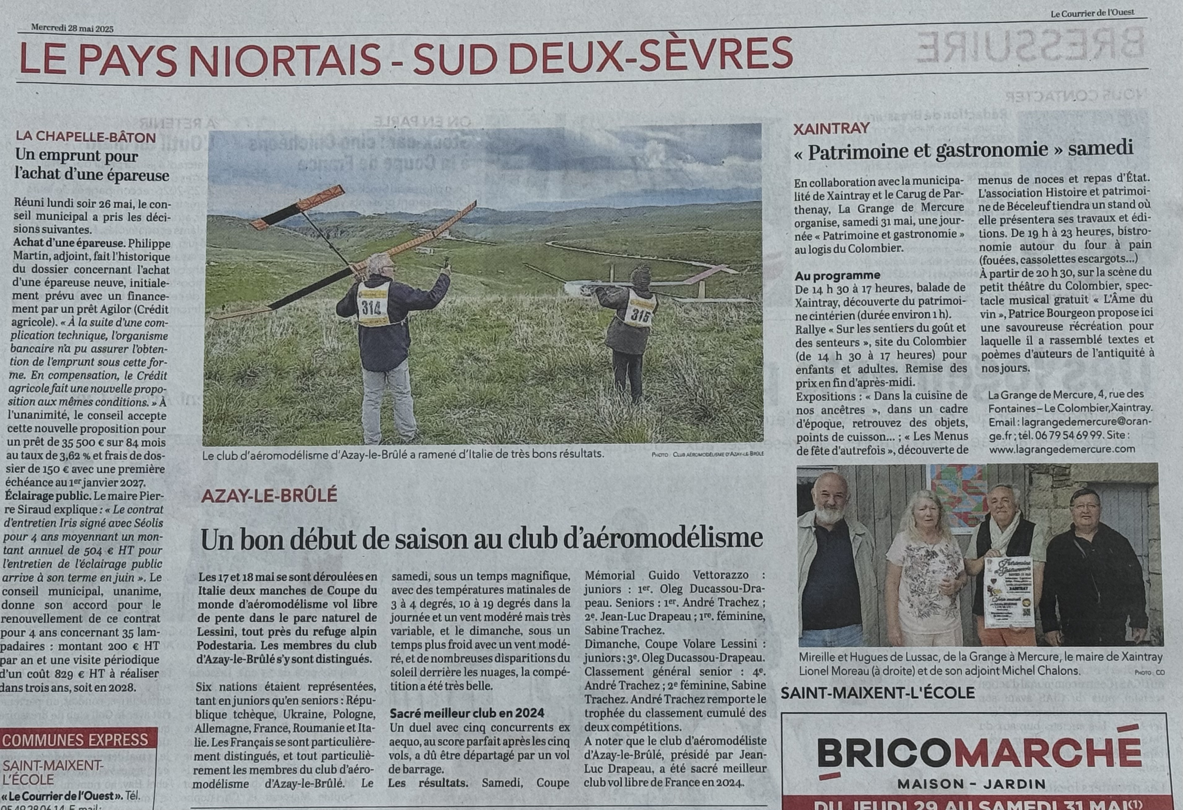 Les 17 et 18 mai se sont déroulées en Italie deux manches de Coupe du monde d’aéromodélisme vol libre de pente dans le parc naturel de Lessini, tout près du refuge alpin Podestaria. Les membres du club d’Azay-le-Brûlé s’y sont distingués.