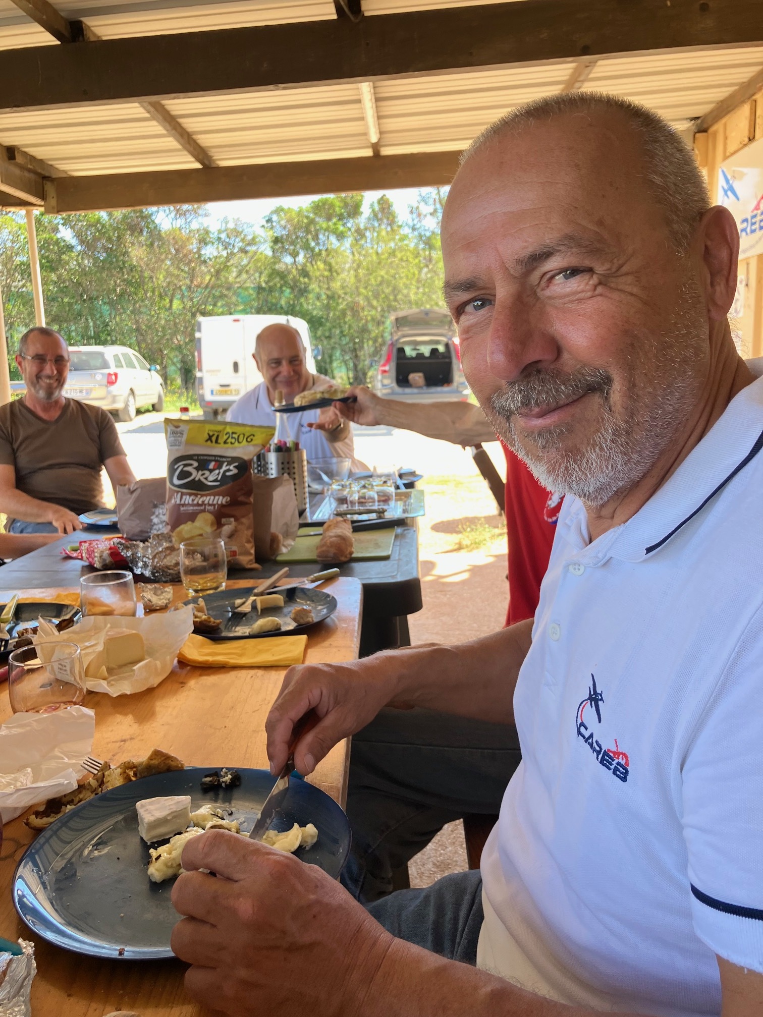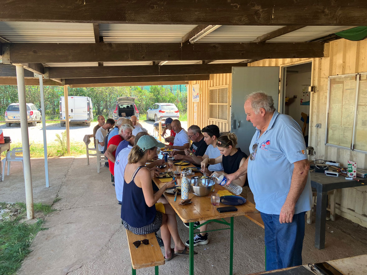 le repas collectif sous l’abri, moment de convivialité et de partage après les épreuves ;