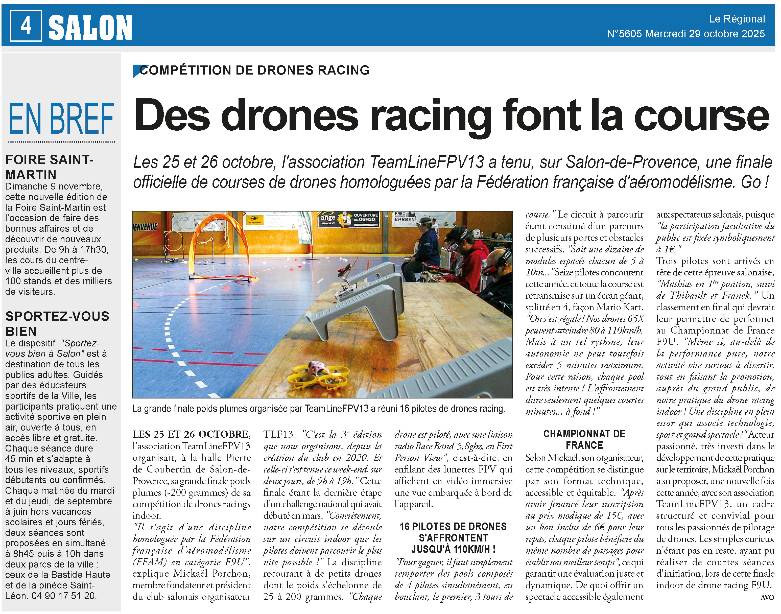 Les 25 et 26 octobre, l'association TeamLineFPV13 a tenu, sur Salon-en-Provence, une finale officielle de courses de drones homologuées par la Fédération française d'aéromodélisme. Go !