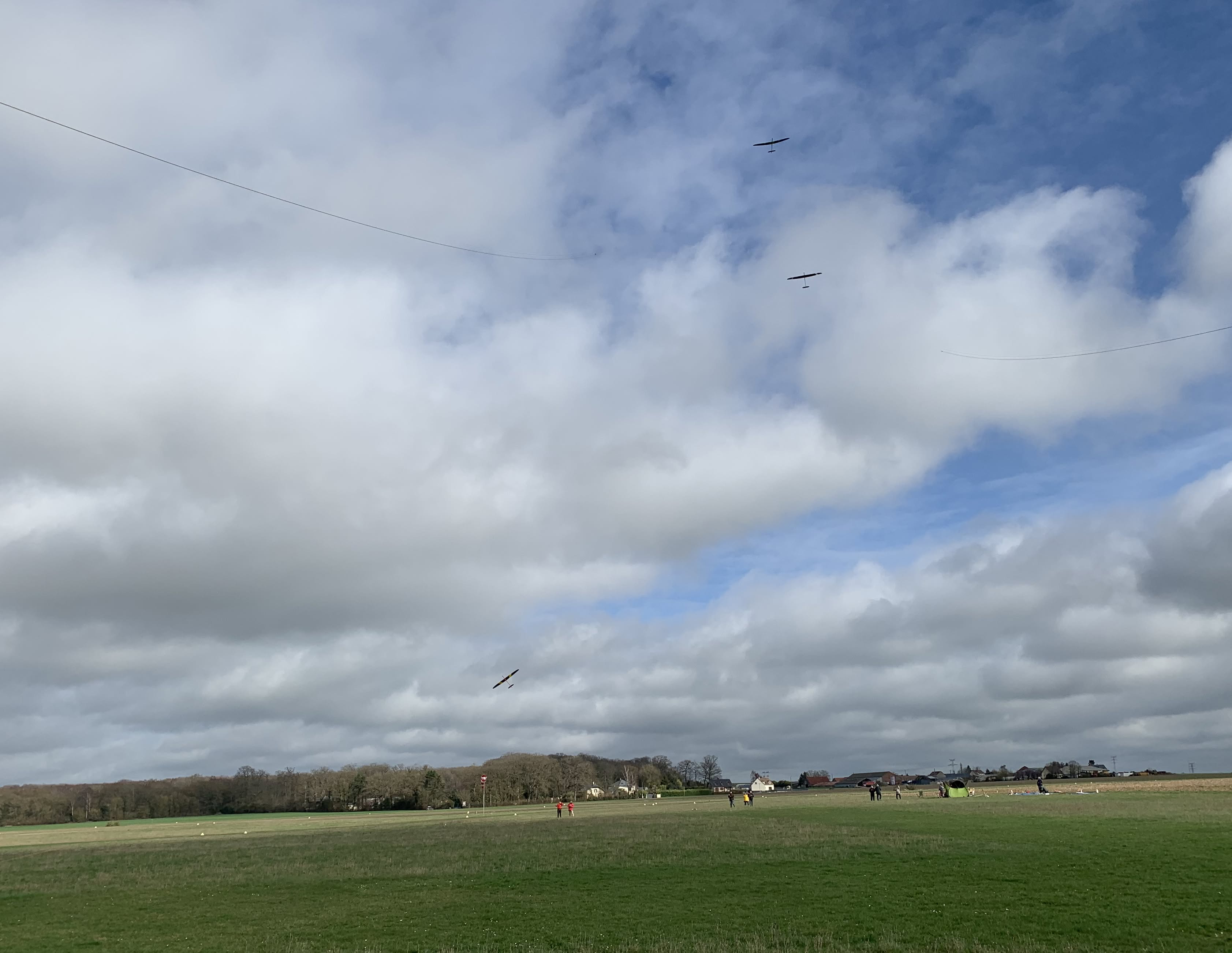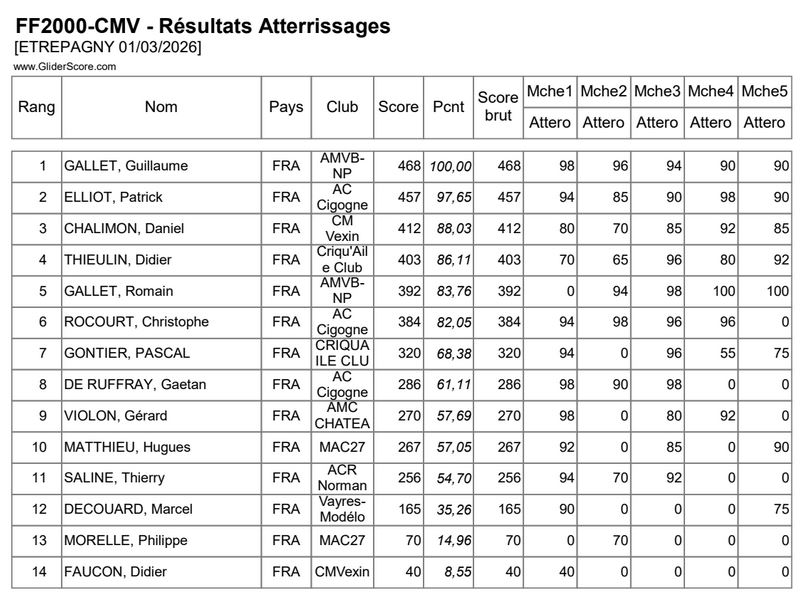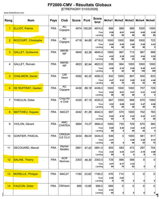 Enfin..., après plusieurs annulations et reports, le CMV à Etrépagny(27) a pu organiser le premier concours formule FF2000 de la saison 2026. Une météo un peu musclée, vent du sud 20km/h avec fortes rafales et température assez basse 5 à 10°C, accueillait les 14 concurrents présents. Quatre sandows installés pour l'occasion avec des manches à quatre séries durant environ 40' autorisaient une bonne cadence. Après le café de bienvenu, le départ vers les 9h30 sera donné par le président Daniel Chalimon précédé de l'incontournable briefing. Vent moyen au début forcissant en fin de matinée sous un soleil nuageux autorisait des hauteurs de largages importants aidant les pilotes à remplir le contrat des 6'.