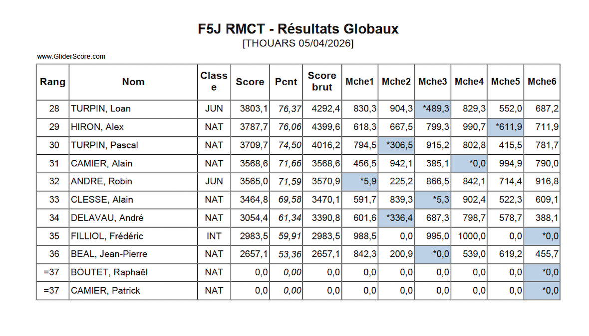 Ce dimanche 5 avril s’est déroulé le concours de F5J organisé par le Radio Modèle Club Thouarsais. Toujours autant de succès pour notre plateforme : 38 inscrits (dont certains venant de Bretagne, Bourgogne, Auvergne) ; 3 membres de l’équipe de France 2026 sénior (Nicolas CHANSARD, Frédéric FILLIOL, Quentin PHILIPPE ; 5 juniors (la relève est là) dont 2 de l’équipe de France 2026 (Gary COSTE et Valentin PONS).